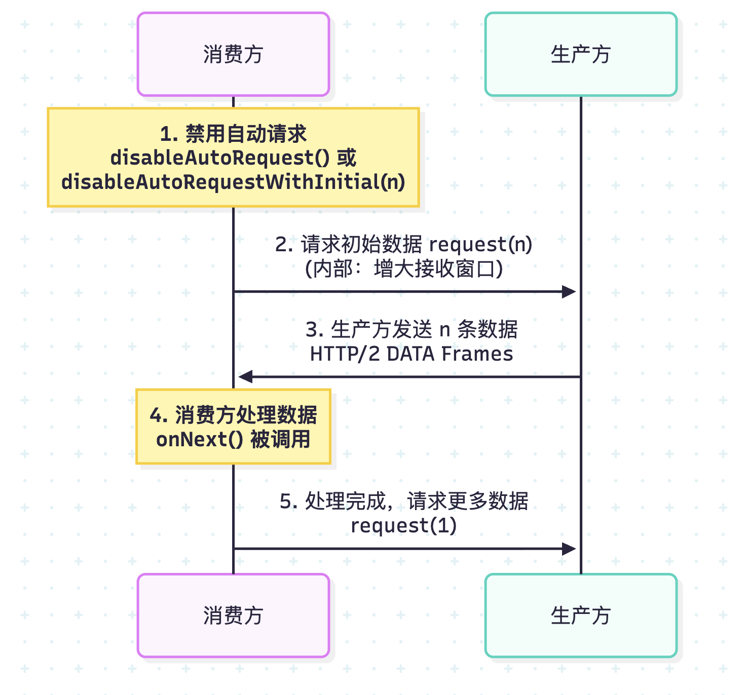 disableAutoFlowControl() / disableAutoInboundFlowControl() - 禁用自动流量控制disableAutoRequestWithInitial(int) - 客户端专用,禁用自动请求并设置初始请求数量disableAutoRequest() - 服务端专用,禁用自动请求request(int) - 手动请求指定数量的消息Triple 背压机制基于 HTTP/2 的流量控制能力实现,涉及以下几个层次: